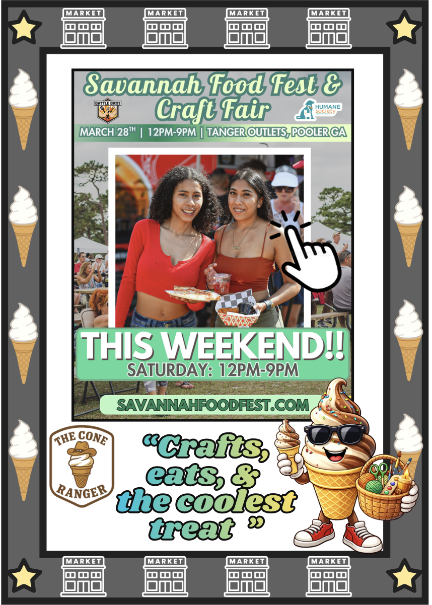 The Cone Ranger is rolling into the Savannah Food & Craft Fair with its one-of-a-kind soft serve trailer, serving up cold, creamy treats with a whole lot of personality. Whether you’re browsing handmade goods or soaking up the festival vibes, swing by for a swirl of chocolate, vanilla, or twist — topped just the way you like it.